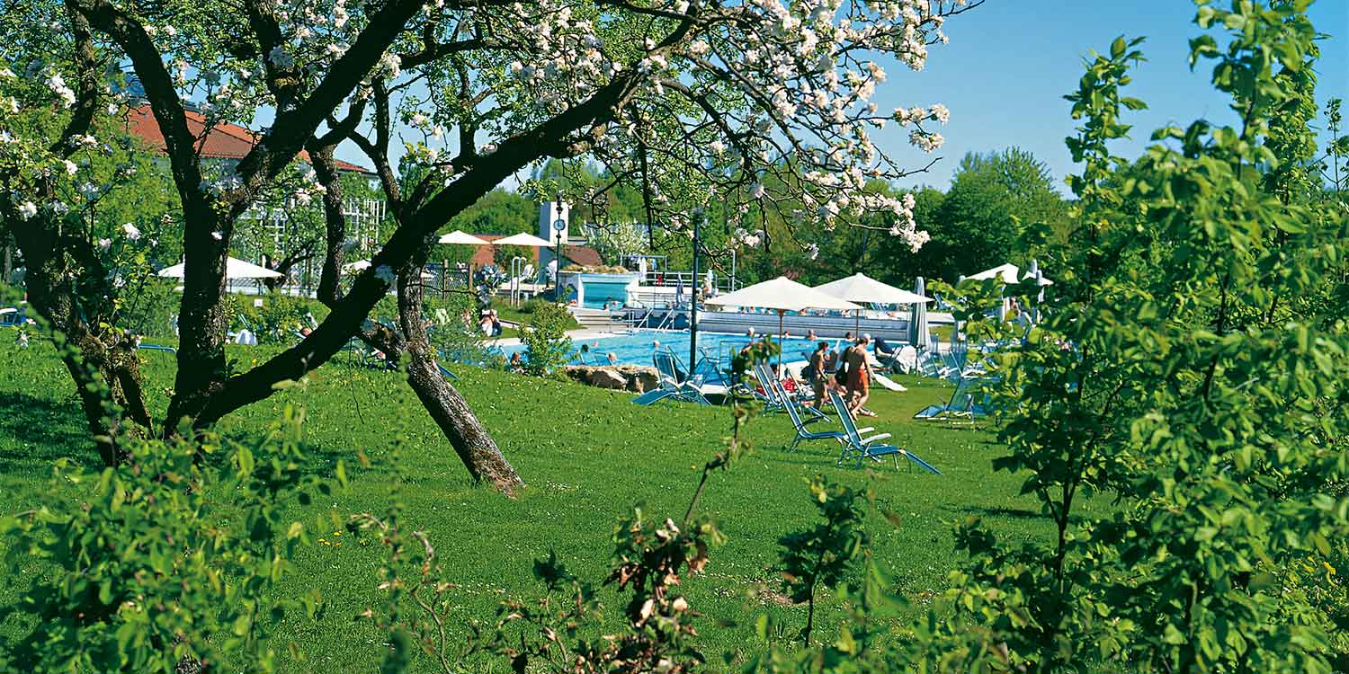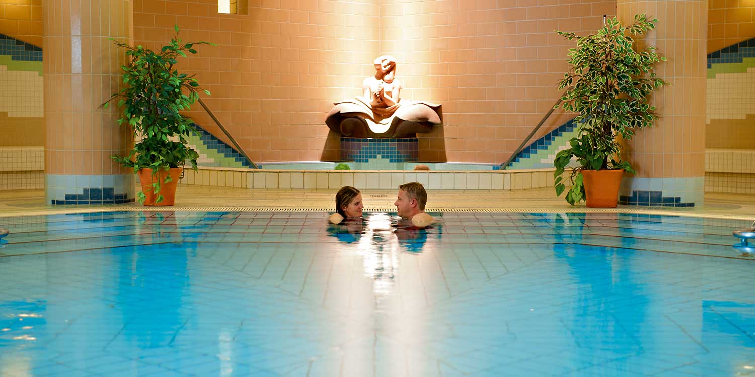 Heilendes Wasser und erholsames Land sind eng ineinander verwoben. Klassisches Thermalbad, unbeschwert und heiter, in einer der größten Thermalbadelandschaften Deutschlands. Es erwarten Sie mittlerweile 30 Thermalbecken mit mehr als 2300 m² Wasserfläche mit Beckentemperaturen von 26° – 40°C. Inmitten herrlicher Natur strömt Sommer wie Winter das Heilwasser aus unserer Kaskade in die Becken. Im Innenreich zieren allegorische Nymphen die großzügigen Badebecken.